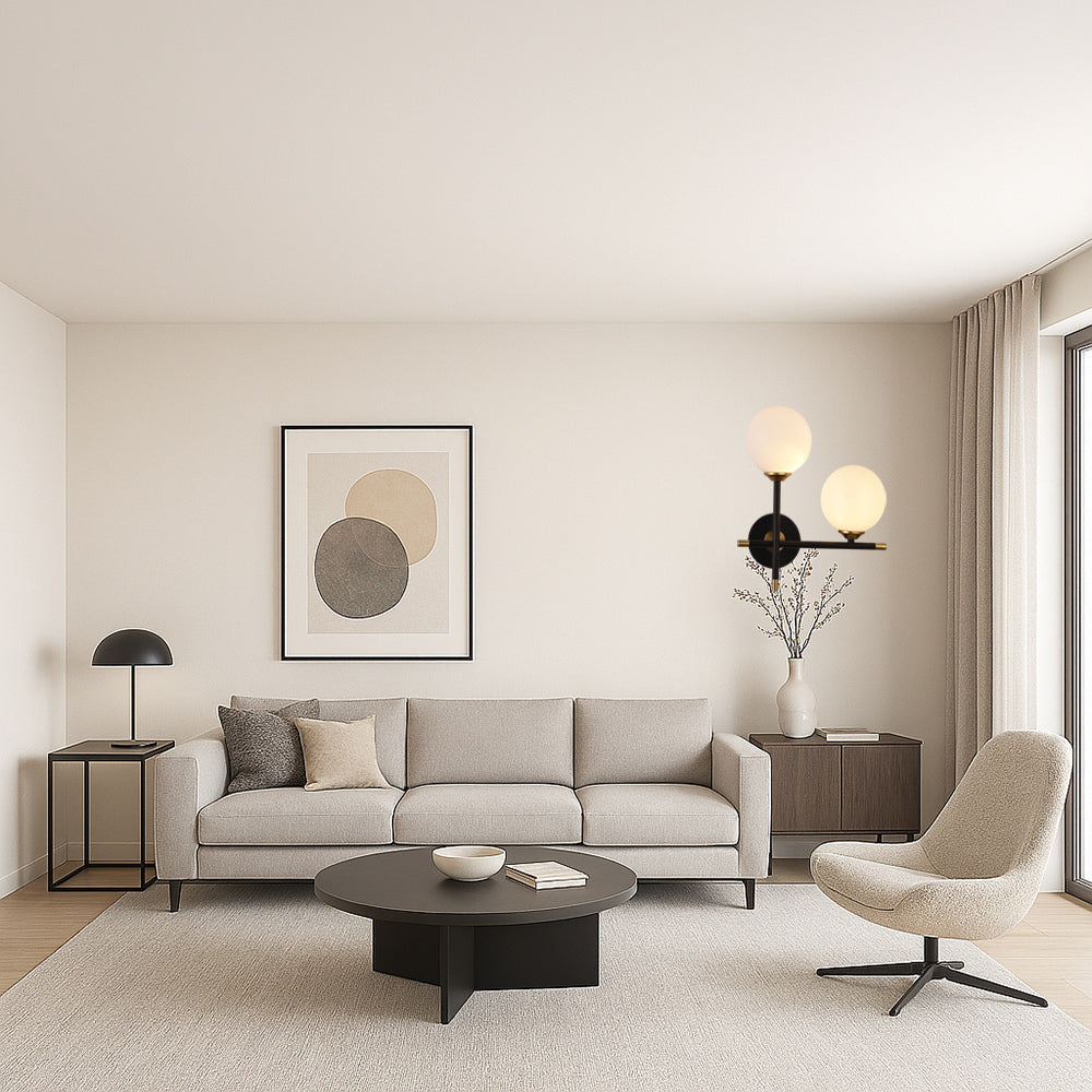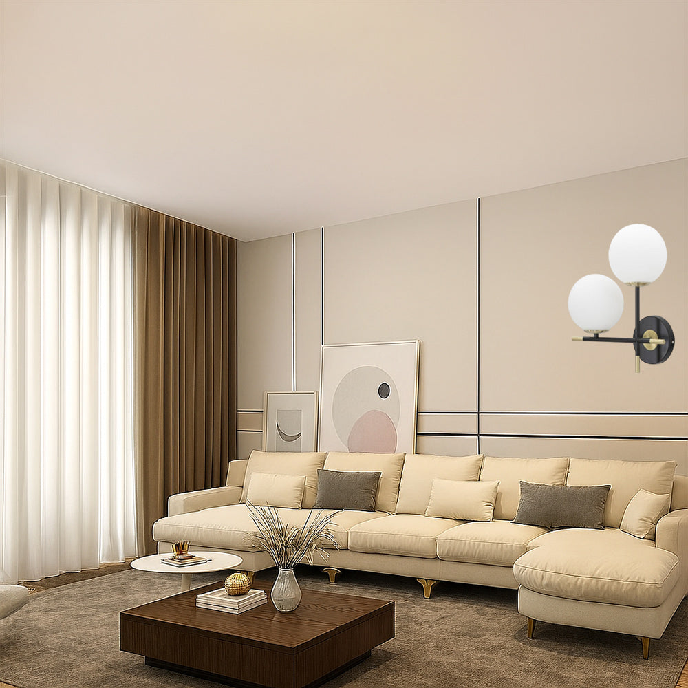 Questo elegante applique da parete è realizzato in metallo con finitura nero opaco e dettagli in oro. e si distingue per il suo design moderno e raffinato. Le due sfere bianche in polietilene. disposte in modo asimmetrico. diffondono una luce morbida e accogliente. ideale per valorizzare qualsiasi ambiente con stile. Il contrasto tra le linee pulite della struttura e la delicatezza delle sfere crea un equilibrio visivo che dona carattere a pareti di soggiorni. camere da letto o ingressi. Dotato di attacco G9. questo applique è compatibile con diverse tipologie di lampadine (non incluse). offrendo versatilità e personalizzazione nella scelta dell'illuminazione. Un complemento d'arredo luminoso che unisce estetica contemporanea e funzionalità. pensato per chi ama i dettagli di design.