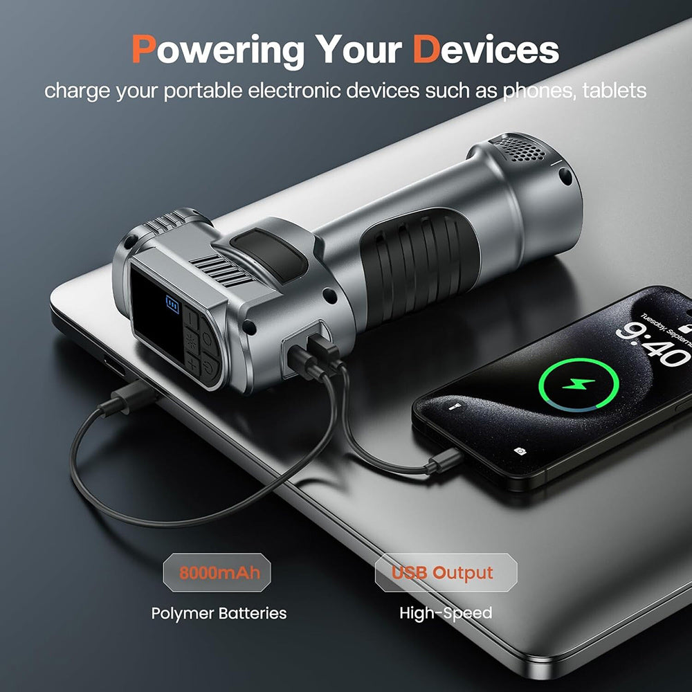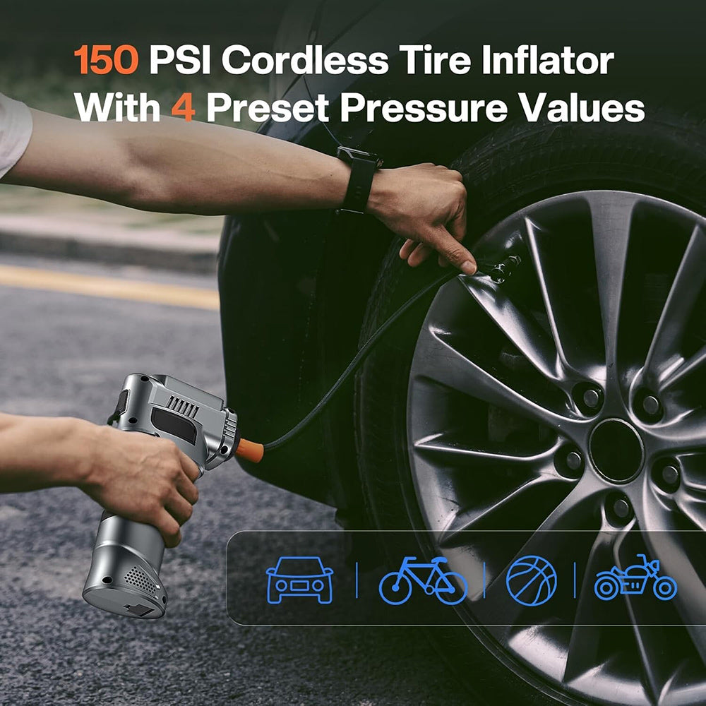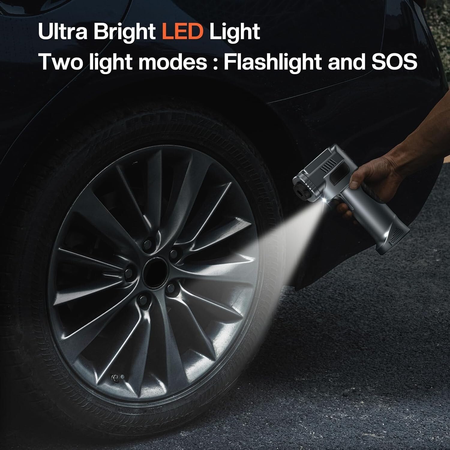 Questo dispositivo multifunzionale 4 in 1 è stato progettato per accompagnarti in ogni viaggio con la massima efficienza. sicurezza e praticità. Si tratta di un attrezzo compatto ma estremamente potente. capace di racchiudere in un unico corpo quattro funzioni indispensabili per chiunque utilizzi un'auto. una moto o una bici. La prima funzione è quella di compressore d'aria intelligente: grazie ai diversi ugelli in dotazione puoi gonfiare pneumatici per auto. moto e biciclette. ma anche gonfiabili e altri accessori. Sul display digitale puoi impostare con precisione la pressione desiderata. da 0.2 a 10.3 bar (3–150 psi). e il dispositivo si fermerà automaticamente una volta raggiunto il valore selezionato. garantendo così sicurezza e comodità. La portata d'aria è di 25 litri al minuto e la precisione del sensore è di 1 PSI. caratteristiche che assicurano un gonfiaggio rapido e affidabile. La seconda funzione è quella di avviatore di emergenza. pensata per non lasciarti mai a piedi. Collegando i cavetti in dotazione sotto l'attrezzo. una spia luminosa rossa e verde ti guiderà nel corretto posizionamento delle morsette sulla batteria. Una volta effettuato il collegamento in modo corretto la spia diventerà verde e il dispositivo sarà pronto per avviare il motore fino a una cilindrata di 5.0 litri. con tensione nominale di 12V. Questa funzione è particolarmente utile in situazioni impreviste. quando la batteria scarica rischierebbe di bloccarti. Il terzo elemento è la torcia integrata. indispensabile se ti trovi a dover intervenire in condizioni di scarsa luminosità o durante la notte. La luce potente ti permette di lavorare in sicurezza e con maggiore precisione. senza dover ricorrere a strumenti aggiuntivi. Infine. il dispositivo si trasforma anche in un pratico power bank. Grazie alle uscite USB e Type-C puoi ricaricare smartphone. tablet e altri dispositivi elettronici. mantenendo sempre con te la possibilità di restare connesso e operativo. Il tempo di ricarica completo del dispositivo è di circa 4-5 ore. un intervallo contenuto che ti permette di averlo sempre pronto all'uso. Compatto. robusto e facile da riporre nel bagagliaio. questo attrezzo multifunzionale rappresenta un vero alleato per affrontare viaggi lunghi. spostamenti quotidiani o situazioni di emergenza. La combinazione di compressore. avviatore. torcia e power bank lo rende un compagno insostituibile. capace di unire tecnologia. praticità e sicurezza in un unico strumento. Con lui al tuo fianco. ogni strada diventa più sicura e ogni imprevisto più semplice da affrontare.