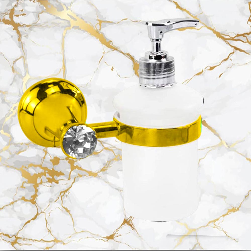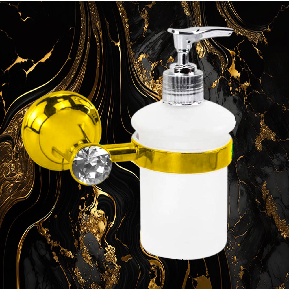 Dispensatore di sapone liquido da muro in acciaio e vetro satinato, impreziosito da un punto luce in cristallo acrilico. Aggiungi un tocco di lusso al tuo bagno con questo accessorio color oro. Pratico e raffinato, perfetto per aggiungere un tocco di eleganza al tuo spazio.