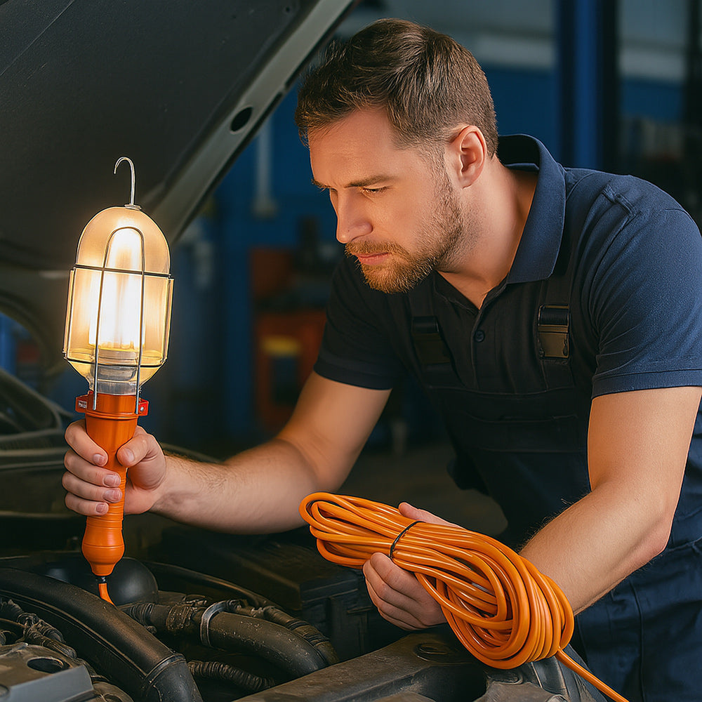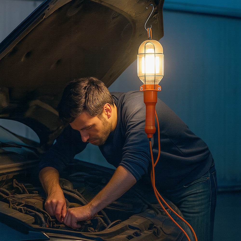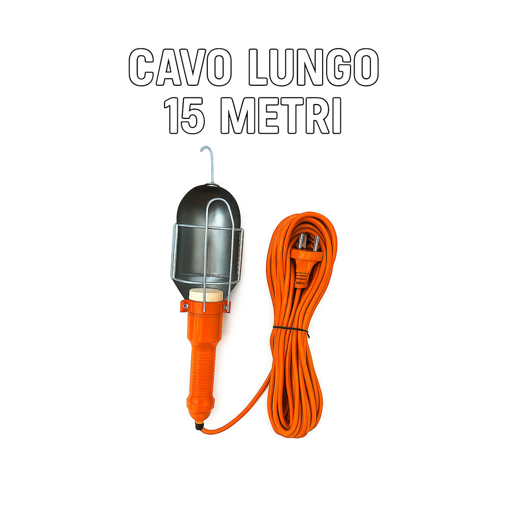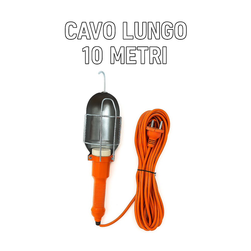 Lampada da officina versatile e pratica. ideale per meccanici. elettrauto. carrozzieri e per chi ama il fai da te. È dotata di interruttore on-off per un utilizzo semplice e immediato. griglia protettiva apribile in alluminio che permette di sostituire facilmente la lampadina. comodo manico in plastica ergonomica e gancio per appenderla così da avere le mani libere durante i lavori. L'attacco E27 (lampadina non inclusa) garantisce compatibilità con le lampadine più comuni. La lampada è disponibile con cavo di tre diverse lunghezze. 5. 10 o 15 metri. completa di spina Schuko per adattarsi a ogni esigenza di lavoro. Una soluzione indispensabile per chi cerca funzionalità. sicurezza e praticità sia in officina che a casa.
