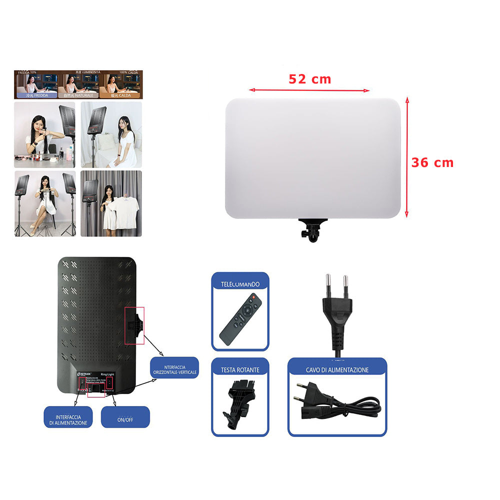 La nostra lampada luce di riempimento è la soluzione ideale per studio fotografico. registrazione video. fotografia. streaming. make-up e molto altro ancora. Dotata di tre tonalità di luce regolabili. offre una gamma che va dalla calda luce da 2700K fino alla fredda da 7500K. permettendoti di creare l'atmosfera perfetta per ogni situazione. Grazie al telecomando incluso puoi gestire facilmente il cambio di tonalità e regolare l'intensità luminosa in base alle tue esigenze. ottenendo sempre il risultato desiderato. In omaggio riceverai un treppiede telescopico regolabile da 67 a 210 cm. che consente di montare la lampada sia in posizione verticale che orizzontale. Il cavalletto è robusto e versatile. adatto anche per macchine fotografiche. proiettori. videocamere e. con supporti opzionali non inclusi. anche per smartphone e tablet.