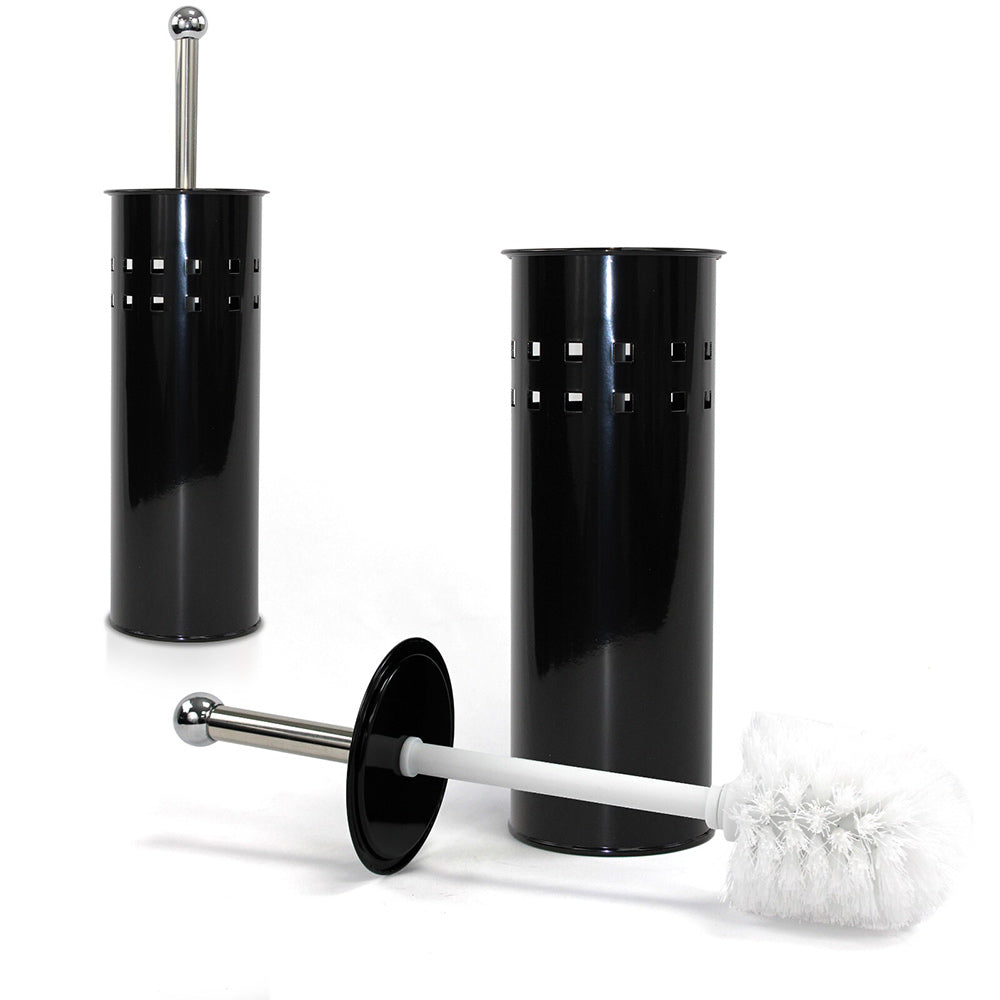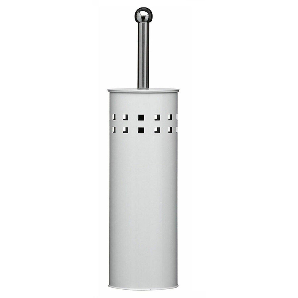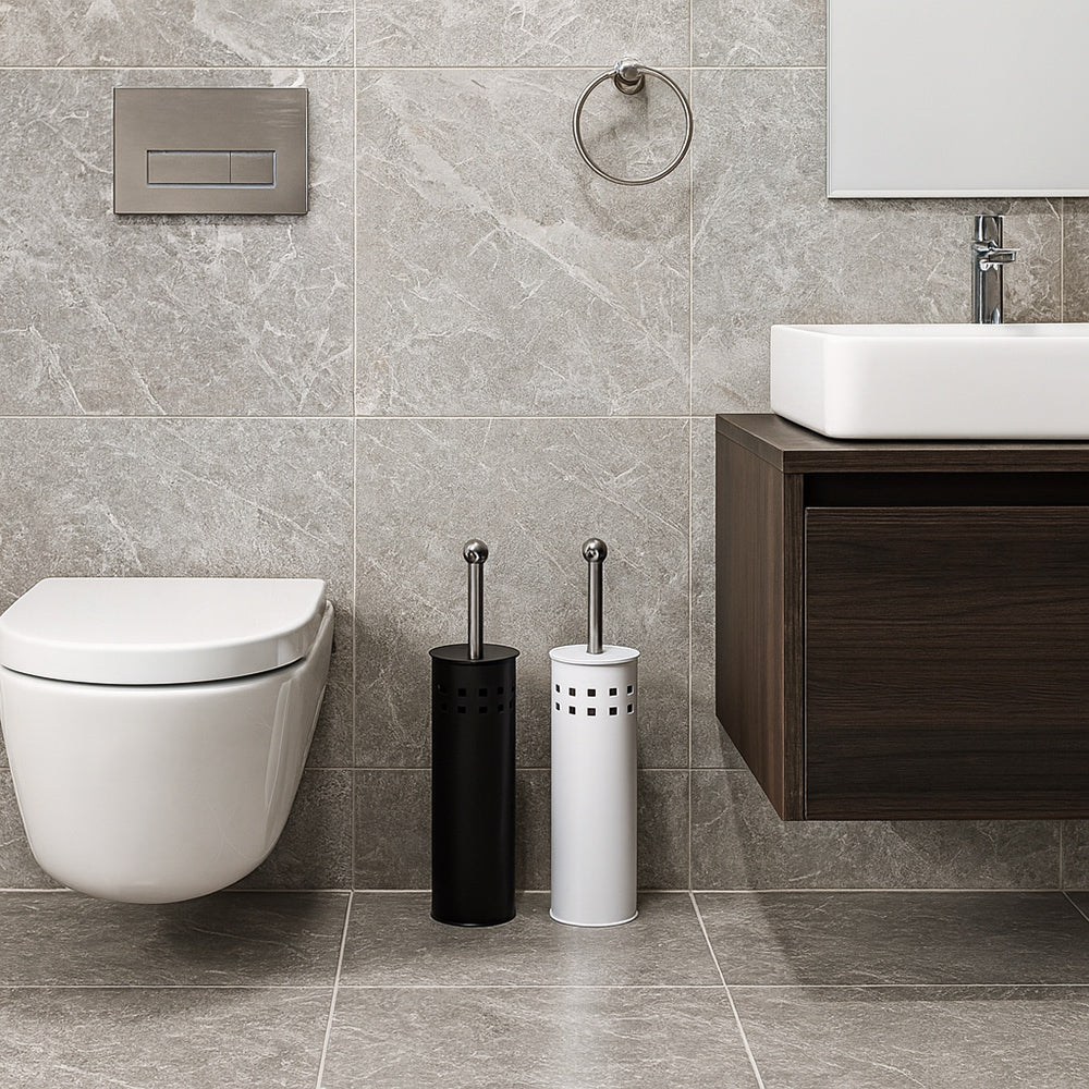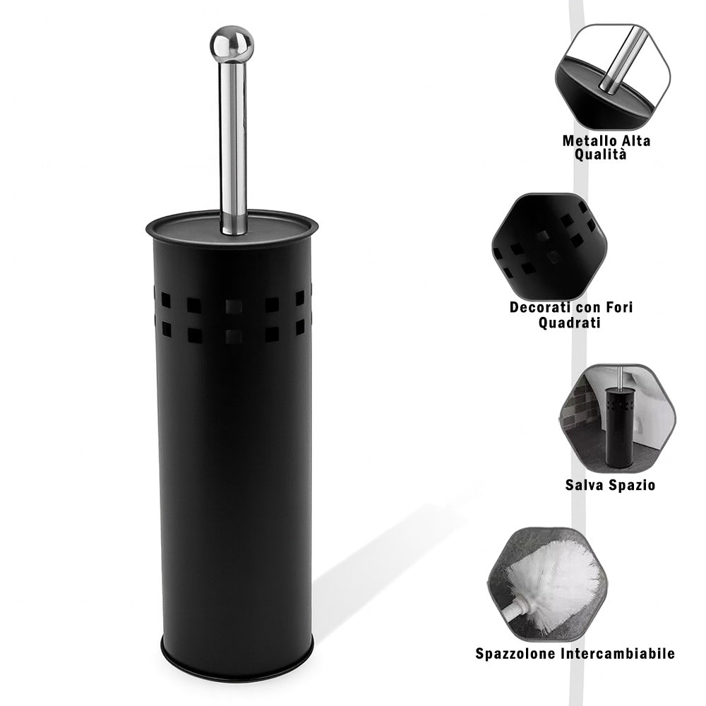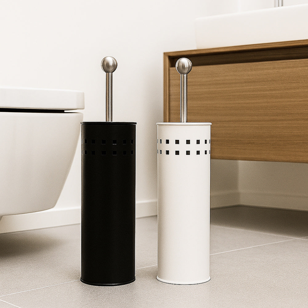 Portascopino a cilindro dal design moderno e funzionale. ideale per completare l'arredo bagno con discrezione ed eleganza. La struttura presenta una decorazione traforata a quadrati che dona leggerezza visiva e un tocco contemporaneo. disponibile in due varianti cromatiche: bianco luminoso per ambienti freschi e minimalisti. oppure nero per spazi più sofisticati e decisi. Il manico dello spazzolone è progettato per essere avvitato sia al coperchio che alla testina. garantendo una tenuta stabile e una sostituzione semplice e veloce in caso di usura. Questa soluzione pratica consente di mantenere l'igiene senza complicazioni. rendendo il prodotto ideale anche per uso frequente. Il cilindro. compatto e proporzionato. si adatta facilmente a qualsiasi angolo del bagno. mentre il gioco di pieni e vuoti della traforatura crea un effetto visivo piacevole e arioso. Pensato per chi cerca un accessorio funzionale ma curato nei dettagli. questo portascopino unisce estetica e praticità in un unico elemento.