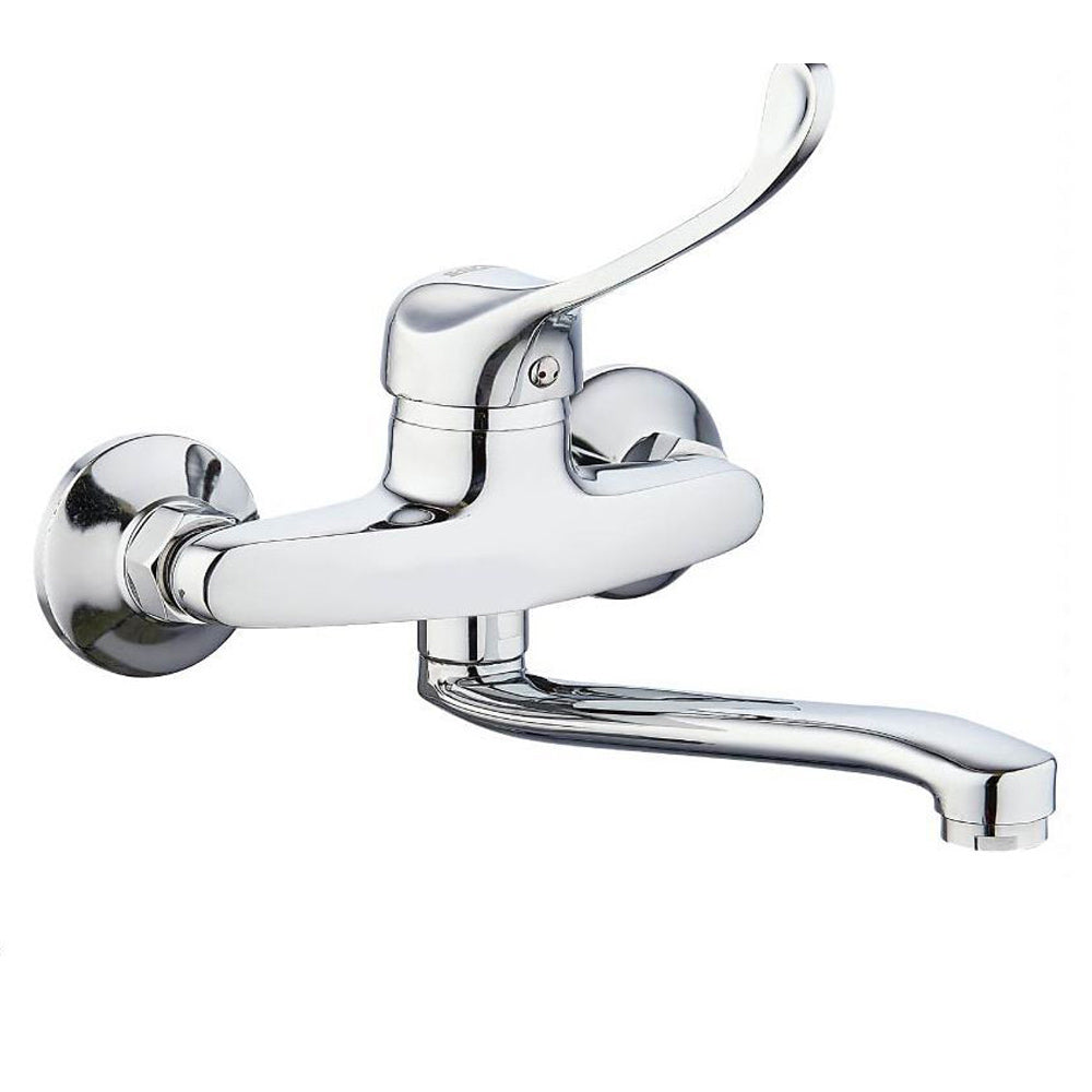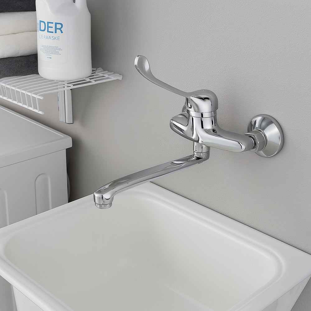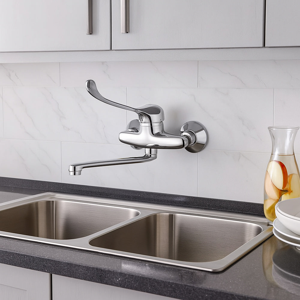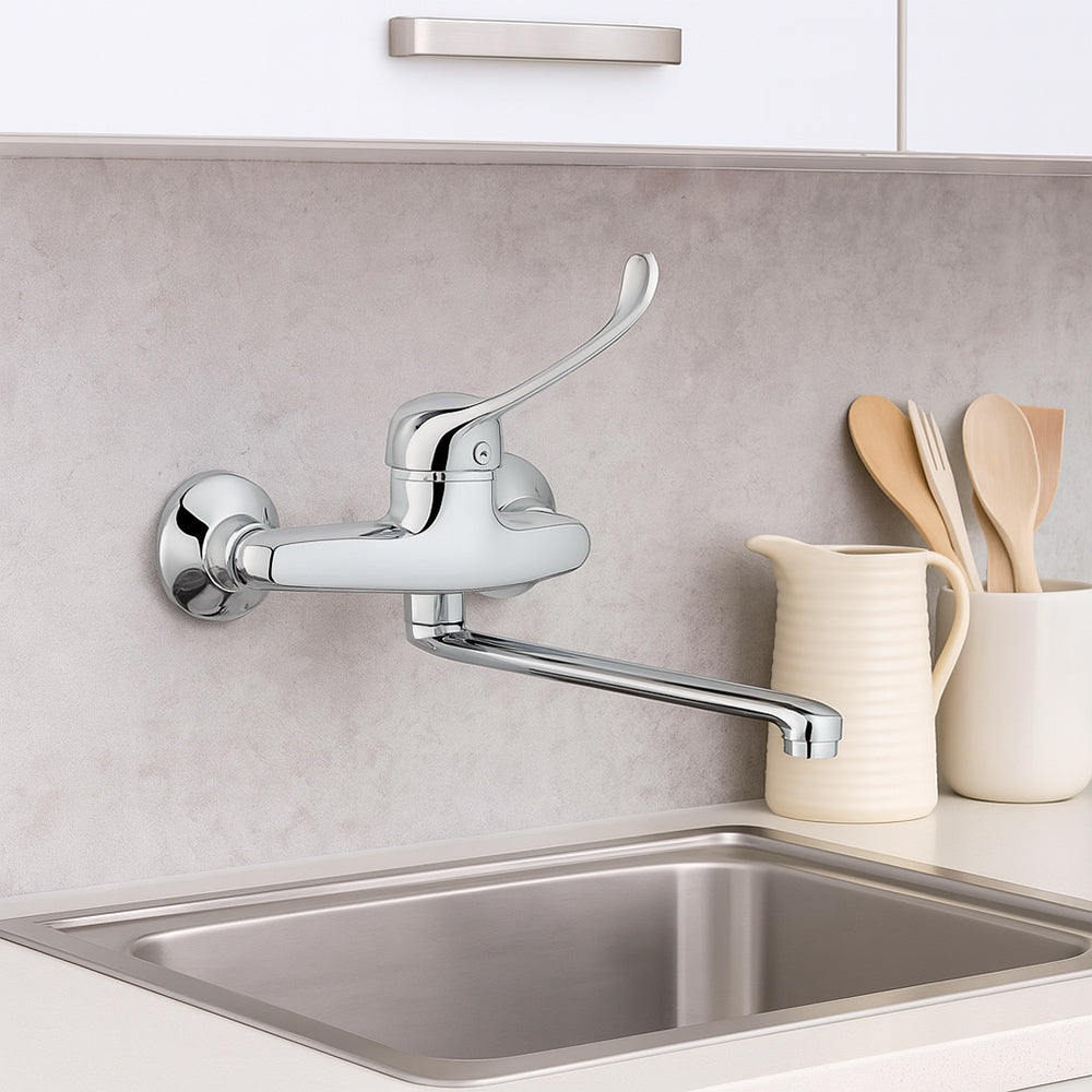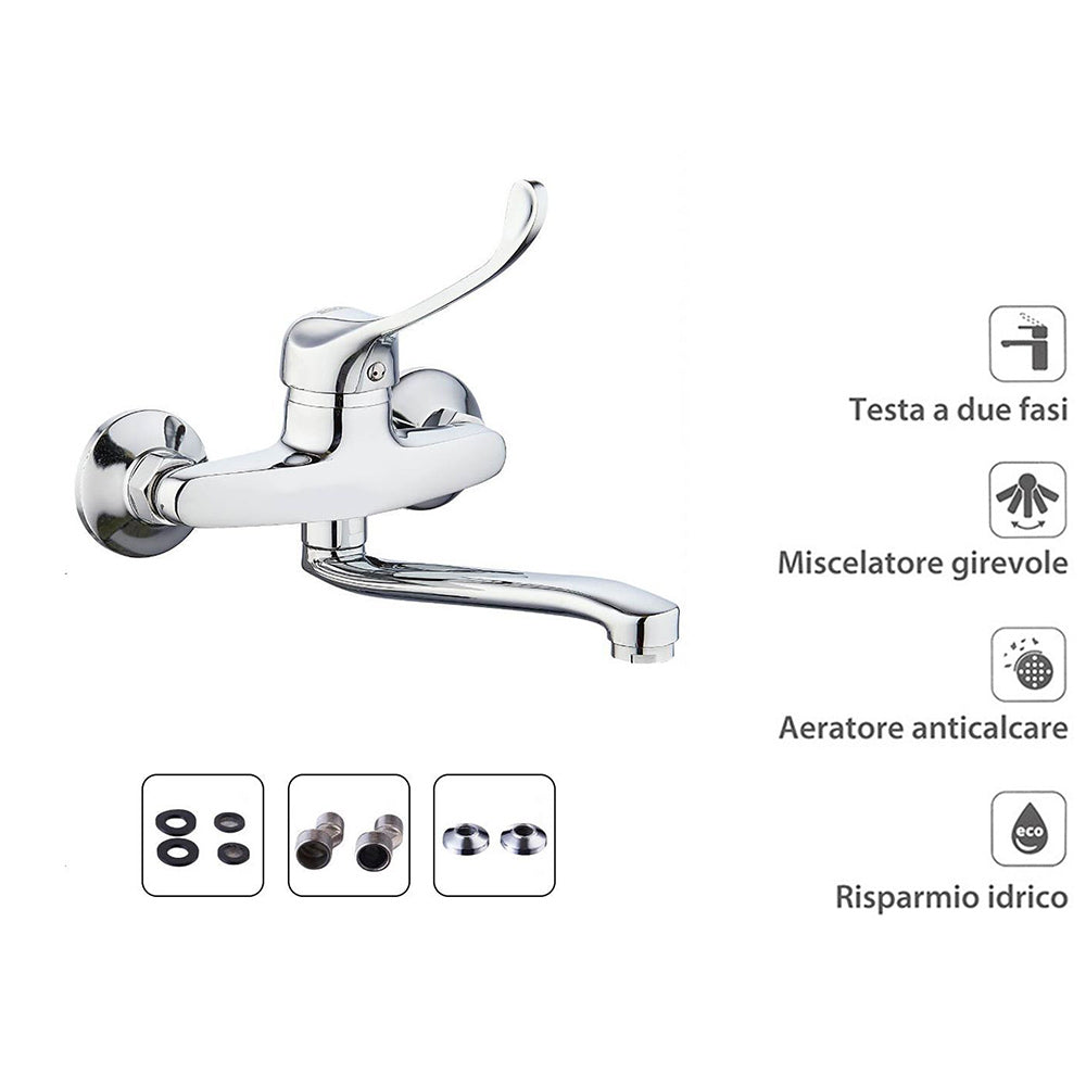 Questo rubinetto miscelatore da parete rappresenta una soluzione versatile e funzionale. perfetta per lavelli a una o due vasche. lavatoi da lavanderia e ambienti professionali come cliniche e ospedali. Il suo design moderno e lineare si integra con eleganza in qualsiasi contesto. mentre il beccuccio orientabile consente una gestione pratica del flusso d'acqua. adattandosi alle diverse esigenze di utilizzo quotidiano. La leva lunga è un dettaglio pensato per favorire l'igiene: può essere azionata facilmente con il gomito. evitando il contatto diretto con le mani appena igienizzate. una caratteristica particolarmente utile in ambienti sanitari dove la sicurezza e la pulizia sono fondamentali. Realizzato in ottone cromato. questo miscelatore garantisce resistenza alla corrosione. facilità di pulizia e una brillantezza che dura nel tempo. La confezione include tutti gli accessori necessari per l'installazione. rendendo il montaggio semplice e immediato anche per chi desidera un intervento rapido ed efficace. È una scelta ideale per chi cerca un prodotto affidabile. pratico e pensato per durare. con un occhio attento sia alla funzionalità che all'estetica.