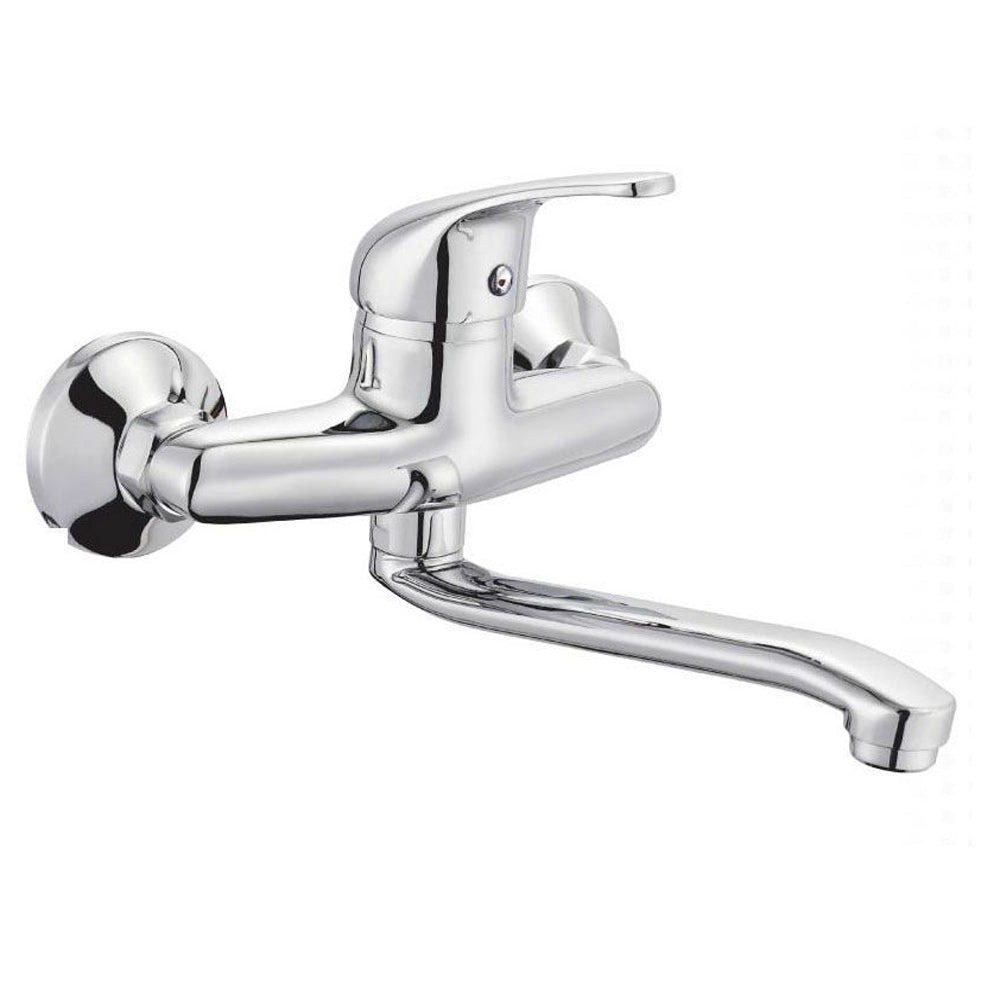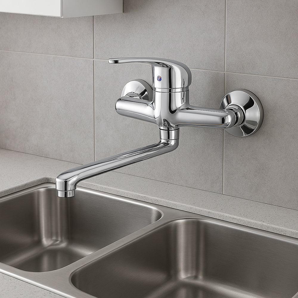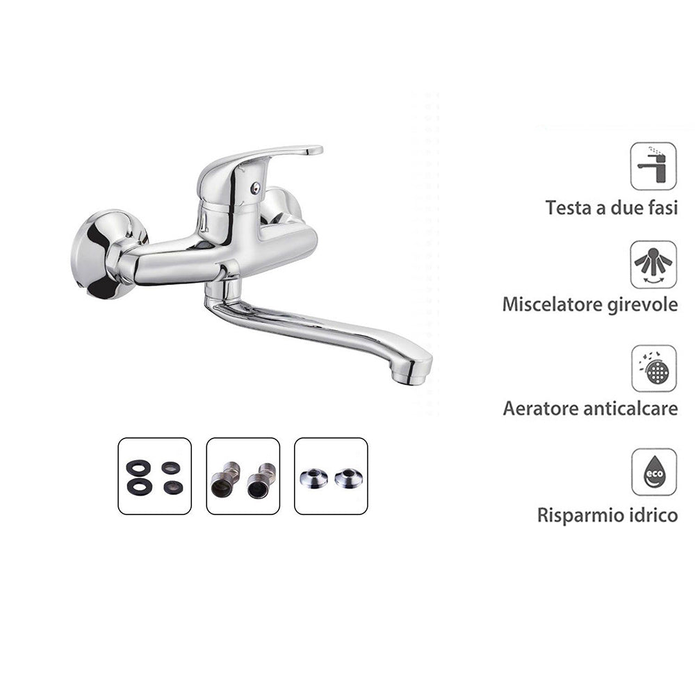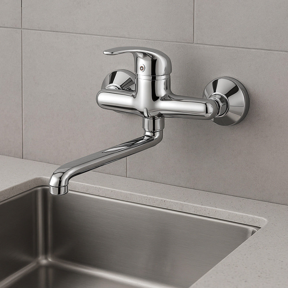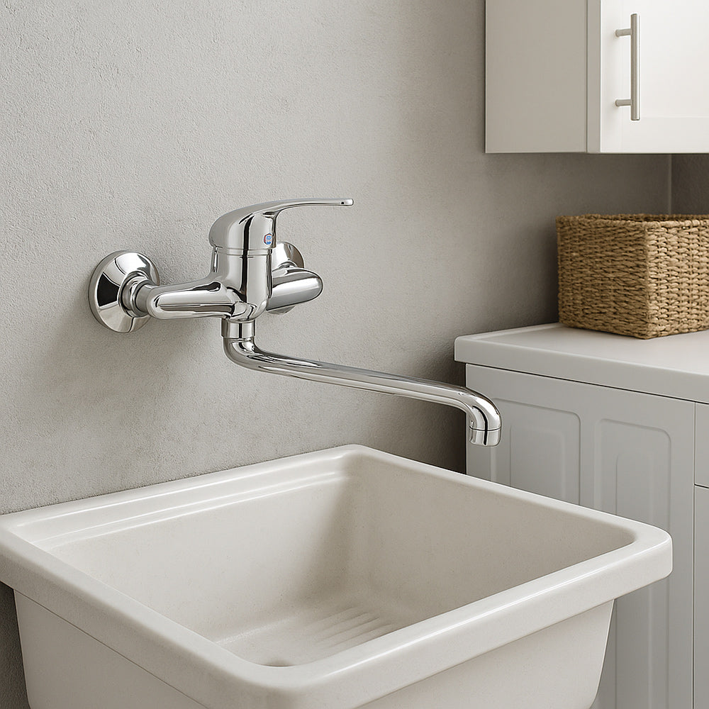 Questo rubinetto miscelatore da parete rappresenta la perfetta combinazione tra design moderno e praticità quotidiana. Progettato per adattarsi con facilità a lavelli a una o due vasche. è la soluzione ideale anche per ambienti di servizio come lavanderie e lavatoi. dove la funzionalità è fondamentale. Realizzato in ottone cromato di alta qualità. offre una superficie lucida e resistente nel tempo. capace di mantenere la sua brillantezza anche dopo anni di utilizzo. Il beccuccio lungo e orientabile consente una gestione flessibile del flusso d'acqua. rendendo ogni operazione più comoda. dal lavaggio delle stoviglie alla pulizia di oggetti voluminosi. La leva monocomando posizionata sulla parte superiore permette di regolare facilmente la temperatura e la pressione dell'acqua. con indicatori intuitivi per acqua calda e fredda. Il design sobrio e raffinato si integra perfettamente in qualsiasi stile di arredamento. dal classico al contemporaneo. Incluso nella confezione troverai tutti gli accessori necessari per un'installazione rapida e senza complicazioni. così potrai godere subito della qualità e dell'efficienza di questo rubinetto. Con questo rubinetto. ogni dettaglio è pensato per semplificare la tua routine quotidiana. offrendo al tempo stesso un tocco di stile e affidabilità. Un prodotto che non è solo funzionale. ma anche bello da vedere.