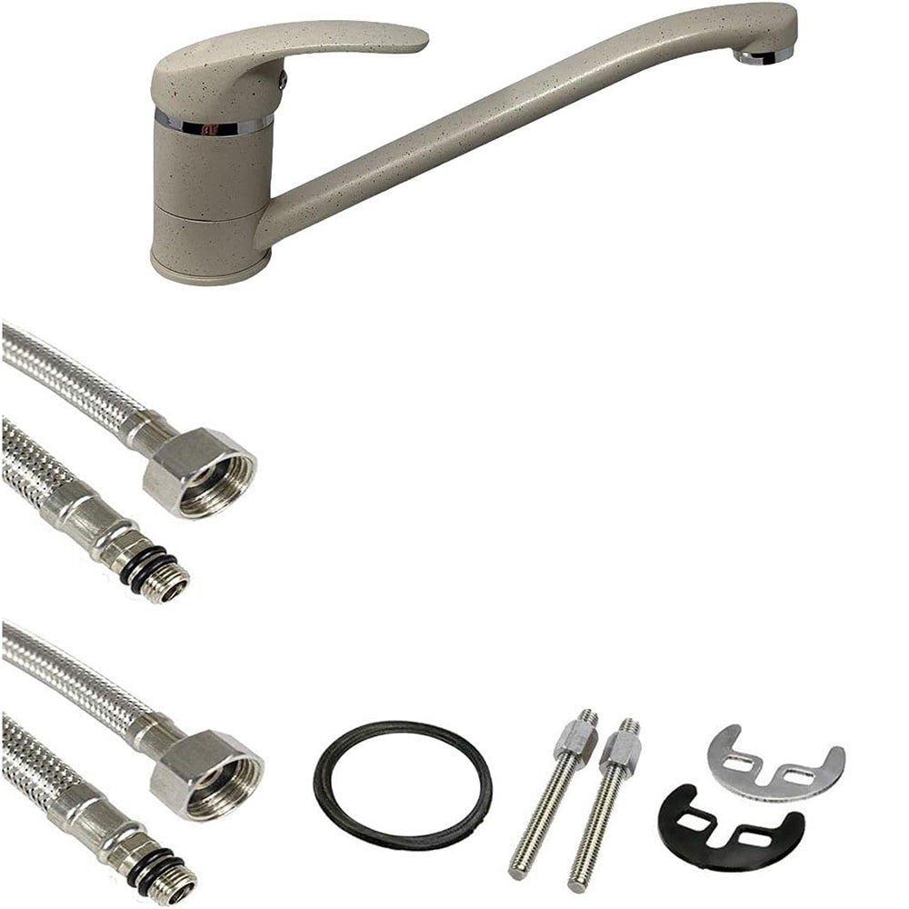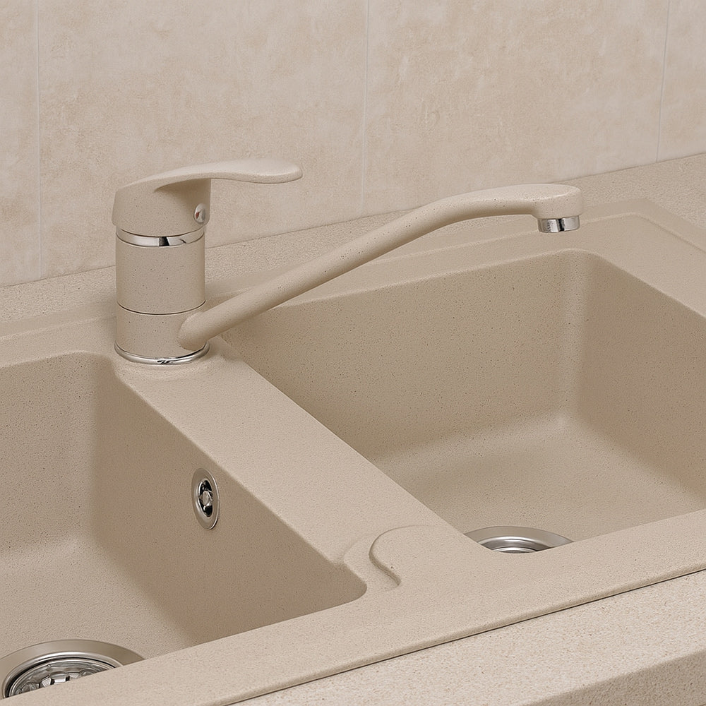 Questo rubinetto da cucina si distingue per il suo design moderno e sobrio. pensato per integrarsi con eleganza in ambienti contemporanei e minimalisti. La finitura in fragranite beige con delicati puntini conferisce un aspetto naturale e sofisticato. mentre i dettagli cromati alla base e sulla punta del beccuccio aggiungono un tocco di brillantezza che ne esalta la forma slanciata. La canna bassa e compatta. con un'altezza di 11.5 cm e una profondità di 26 cm. lo rende ideale per cucine dove lo spazio è prezioso ma non si vuole rinunciare alla funzionalità. Il beccuccio orientabile garantisce una grande versatilità d'uso. adattandosi perfettamente sia a lavelli a una vasca che a quelli a doppia vasca. facilitando le operazioni quotidiane come il lavaggio di stoviglie o il riempimento di pentole. Il diametro del foro di installazione è di 5 cm. mentre la distanza tra la base e il beccuccio è di 10 cm. misure che assicurano una perfetta compatibilità con la maggior parte dei piani cucina. Il comando monoleva. posizionato lateralmente. è intuitivo e pratico. dotato di indicatore rosso e blu per la regolazione dell'acqua calda e fredda. offrendo un controllo preciso della temperatura e del flusso. Pensato per un utilizzo quotidiano intenso. questo rubinetto unisce affidabilità e stile. diventando un elemento funzionale ma anche decorativo. capace di valorizzare l'intero spazio cucina con discrezione e carattere. Completo di tutti gli accessori necessari per l'installazione. consente un montaggio semplice e veloce. garantendo da subito una perfetta operatività.