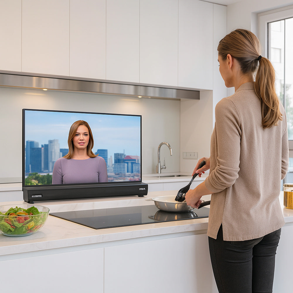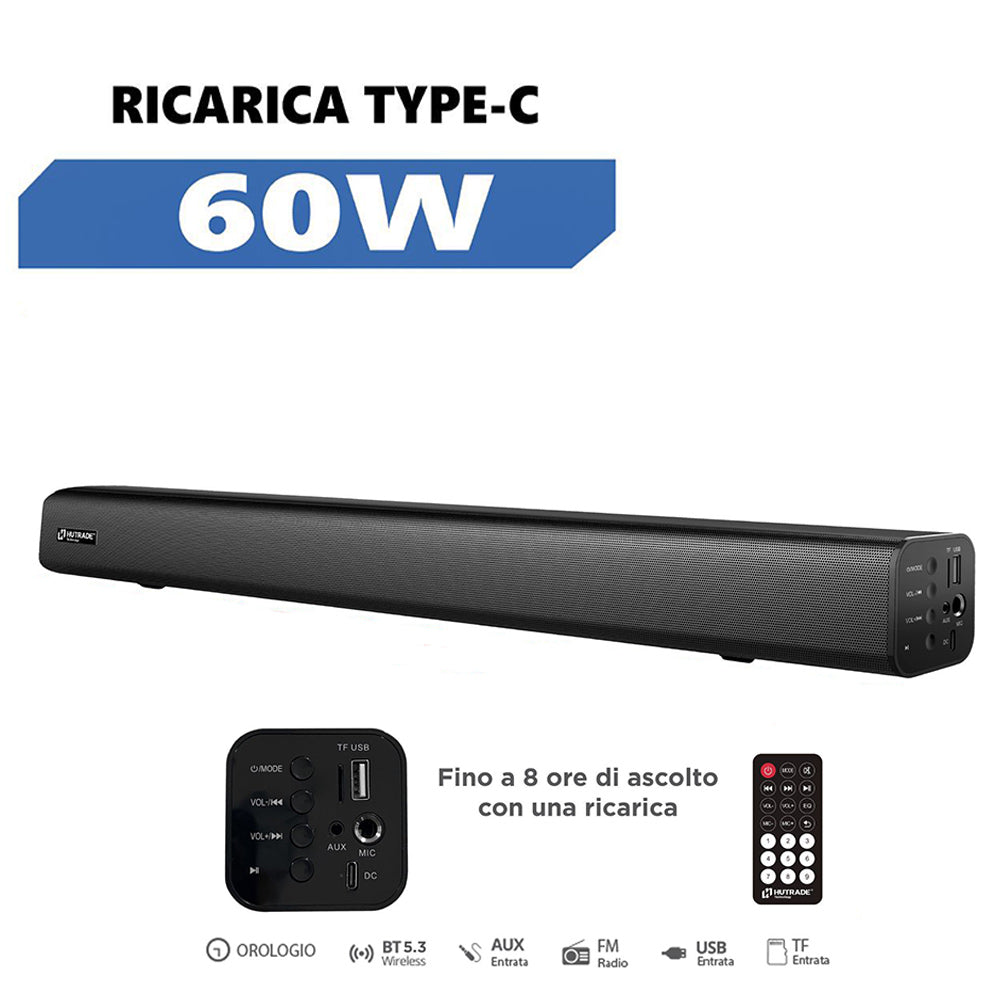 La nostra soundbar è molto più di un semplice diffusore audio: è un compagno sonoro che trasforma ogni ambiente in un'esperienza immersiva. Ricaricabile tramite cavetto Type-C. ti offre fino a circa 8 ore di ascolto continuo. liberandoti dai limiti dei cavi e accompagnandoti ovunque tu voglia portare la tua musica. Basta un attimo per connettere il tuo smartphone o tablet via Bluetooth e dare vita a playlist. podcast e contenuti multimediali con una qualità sonora sorprendente. Sul fronte della soundbar. un orologio digitale sempre visibile scandisce il tempo con stile. integrandosi perfettamente nel design moderno e minimale. E quando hai voglia di leggerezza. la radio FM ti regala momenti di svago e compagnia. con le tue stazioni preferite sempre a portata di mano. Pensata per adattarsi a ogni esigenza. questa barra surround è dotata di ingressi AUX. USB e TF. per permetterti di scegliere liberamente la sorgente audio. La potenza non è solo una promessa: con 60 watt P.M.P.O e 20 watt R.M.S.. il suono è pieno. dinamico. capace di riempire la stanza e valorizzare ogni dettaglio. dai bassi profondi alle voci cristalline. E per un controllo intuitivo e completo. anche a distanza. il telecomando incluso ti consente di gestire ogni funzione con semplicità: volume. modalità. sorgenti. tutto sotto controllo con un solo gesto. Questa soundbar non è solo tecnologia: è atmosfera. è ritmo. è presenza. È pensata per chi cerca funzionalità. ma anche emozione. Per chi vuole un oggetto che suoni bene. ma che parli anche di stile. comfort e libertà.