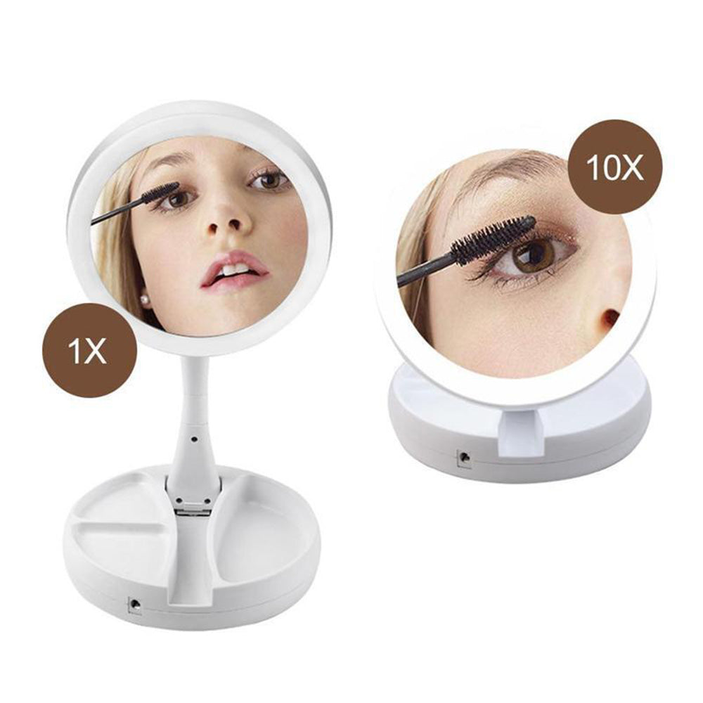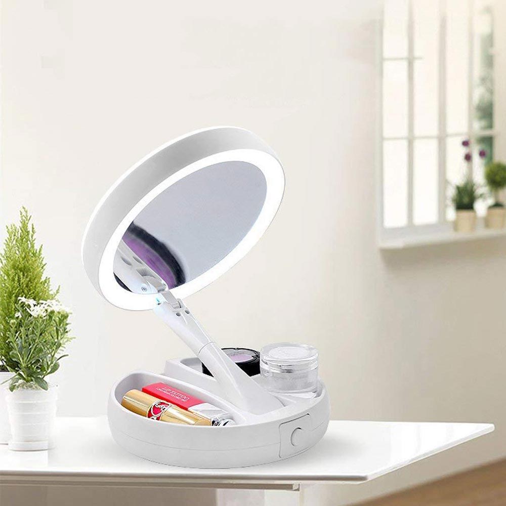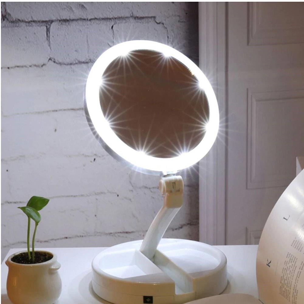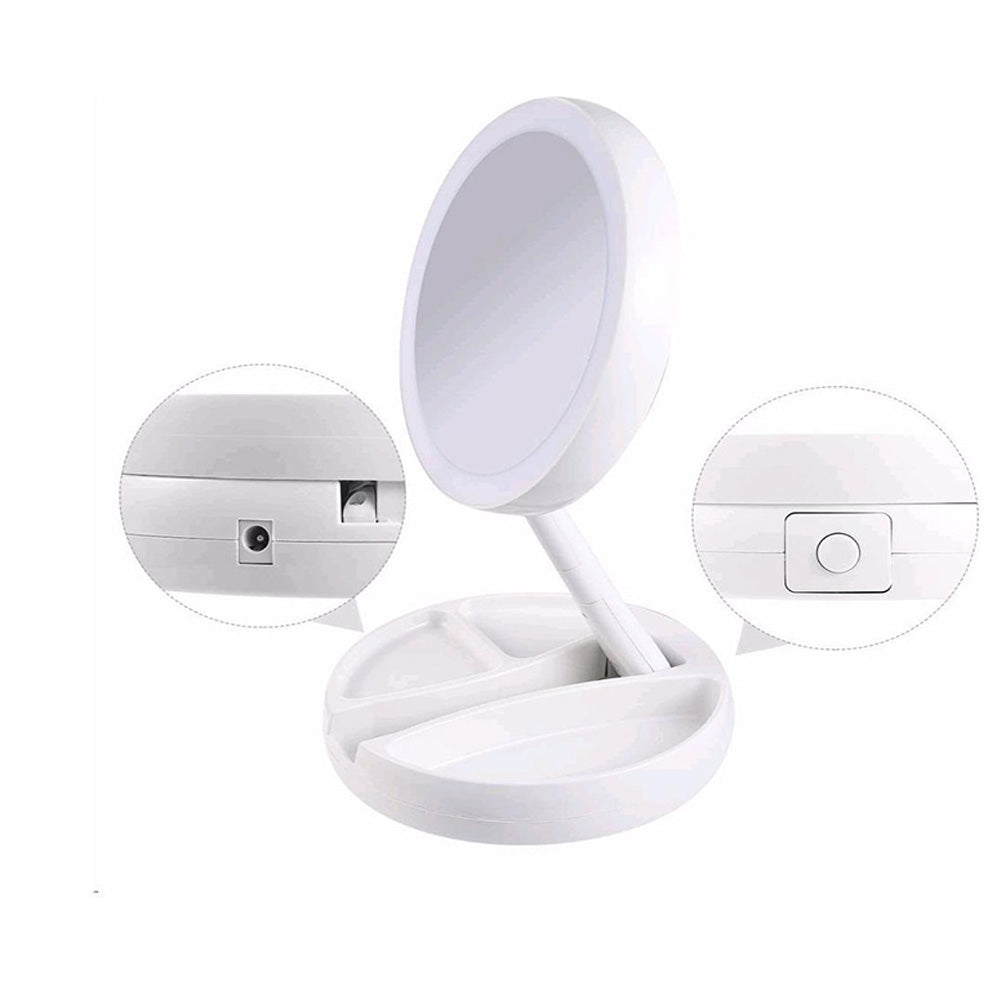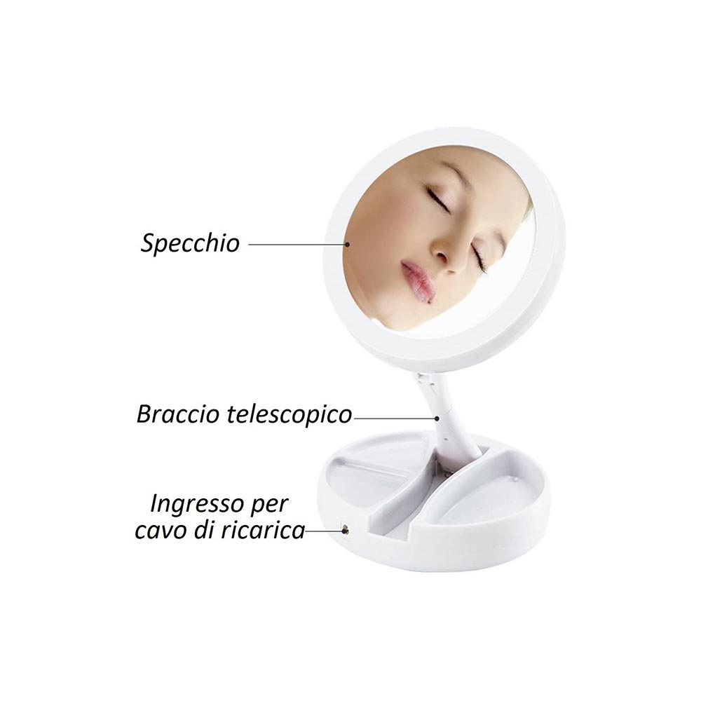 Questo specchio con luci LED richiudibile e ricaricabile è un accessorio indispensabile per la tua routine di bellezza. Dotato di un vano inferiore che funge da portatrucchi o portagioielli, ti permette di avere tutto a portata di mano. Lo specchietto doppio con ingrandimento 1x e 10x ti consente di applicare il trucco con precisione e di esaminare da vicino la tua pelle. Le luci LED integrate illuminano perfettamente il viso, garantendo un'applicazione impeccabile del makeup. Compatto e portatile, questo specchio è ideale per l'uso a casa o in viaggio. Ricaricabile tramite USB, non dovrai più preoccuparti di sostituire le batterie. Sfrutta al massimo la sua versatilità e praticità per una routine di bellezza senza sforzo.